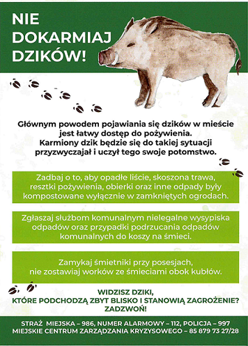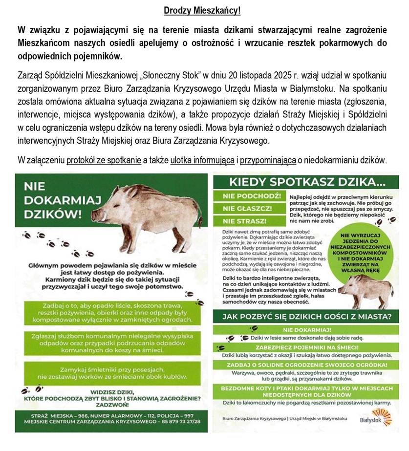 Biuro Zarządzania Kryzysowego informuje, że od dnia 26 września 2025 roku Straż Miejska rozpocznie akcję rozmieszczania preparatów odstraszających dziki w rejonach osiedli Spółdzielni Mieszkaniowej "Słoneczny Stok".